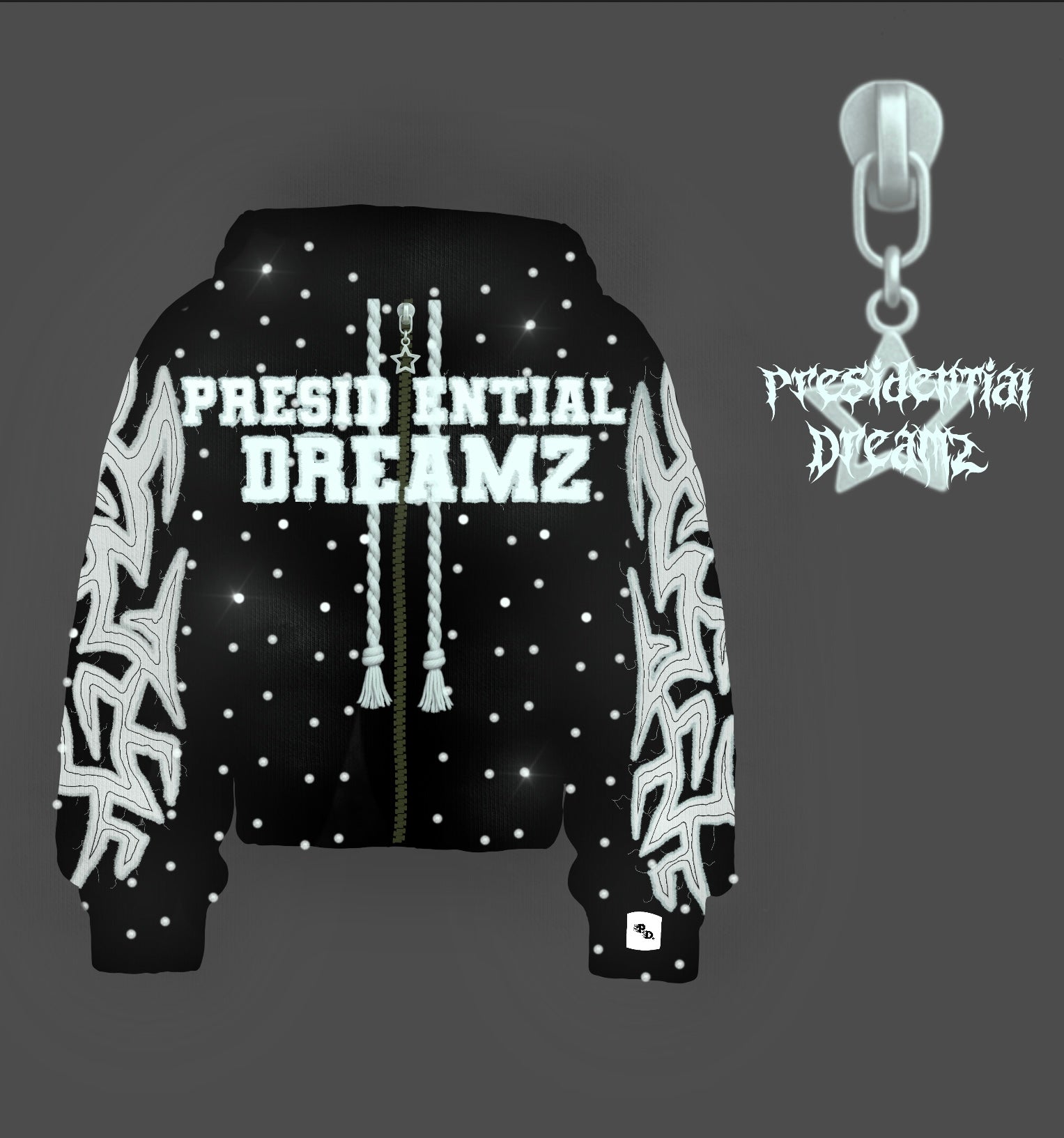 Featuring distressed “PRESIDENTIAL DREAMZ” lettering across the chest, custom rope drawstrings, and a standout all-over rhinestone detail that demands attention. The bold distressed sleeve designs and PD patch logo add signature touches of luxury and authenticity, while the custom star zipper pull completes the exclusive feel.